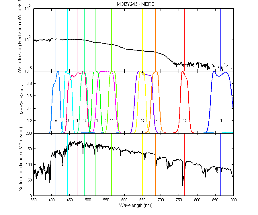 Satellite band averaged data: water-leaving radiance, surface irradiance and solar normalized water-leaving radiance. These values are given as the mean flux (not the total flux) for each band. The total and in-band averages are calculated for each satellite. The in-band is calculated by limiting the relative spectral response to within 1% of the maximum value. A separate data listing (denoted by it's hour) is presented when MOBY collects more than one file per day. Six water-leaving radiances can be calculated from different combinations of MOBY four radiance collectors. The best water-leaving radiance is Lw1, determined from the upper two arms. Lw7 is also included and is calculated from the middle and bottom arms.