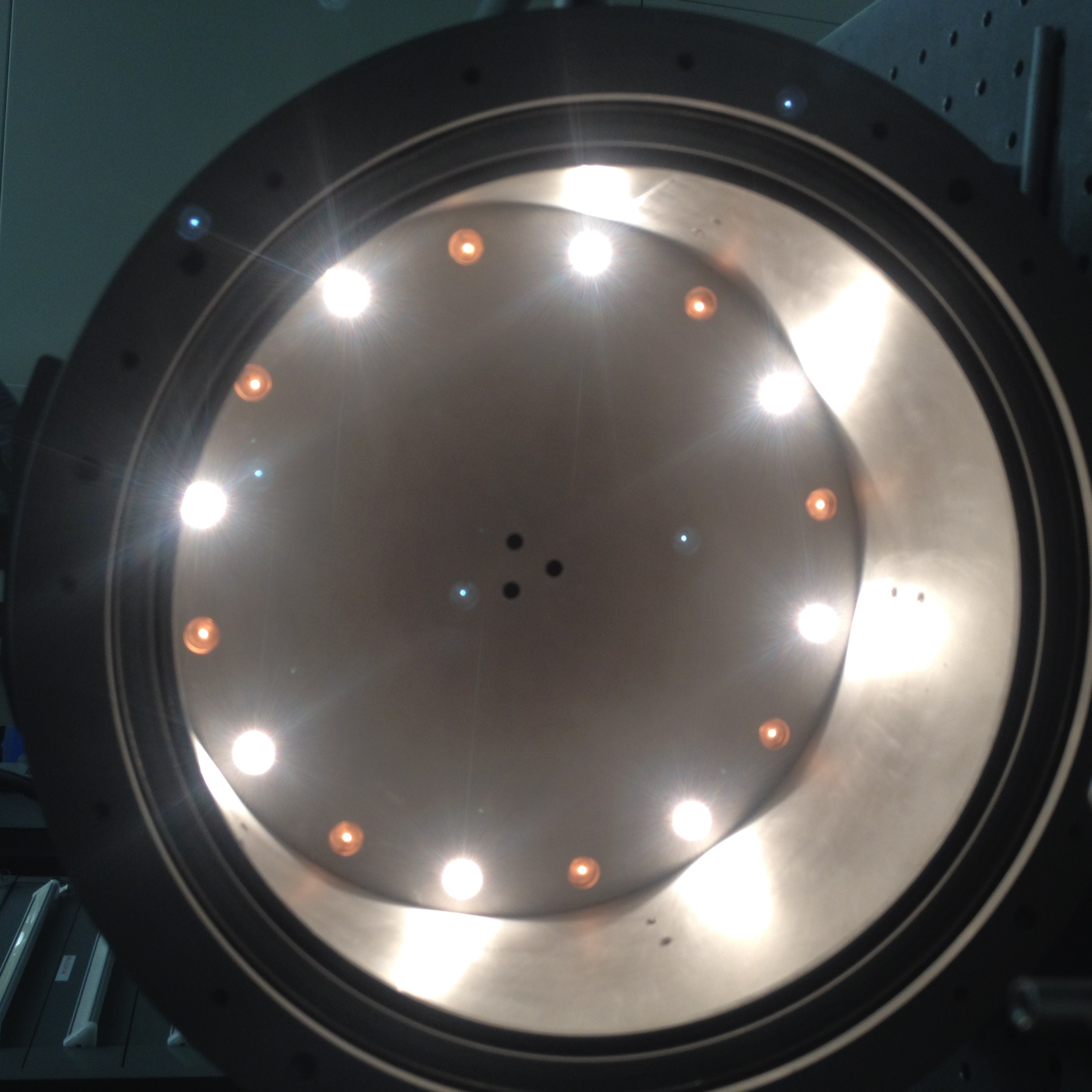 The YES SQM (see the manual under “Documentation”) has two lamp rings on the outer diameter of the back wall of a cylindrical chamber. See Photo SQM_no_front_lamps_on.jpg attached. The walls are bead blasted aluminum. The front is a piece of acrylic diffuser, 9.375” +/-0.005” diameter by 0.114” thick (actual). It is protected by a glass window, 9.914”+/-0.005” diameter, 0.370” thick (best vendor effort). O-rings and a large plastic washer seal and protect these parts. The window/diffuser are held in place with the SQM front flange. See IMG_1420.jpg attached for how this looks assembled. The SQM adaptor plate is spaced away from the flange using a light tight ring (IMG_1413.jpg), which is held in place by the SQM mounting flange. Looking into the assembled SQM (IMG_1411.jpg) you can see the DUT is held in place by the black locking rings. In the attached PDF file, Figure A is the adaptor plate, Figure B is the light tight ring, and Figure C is the spacer (there are five in total) – see the attached file “SQM Front Flange Assembly.pdf”.
